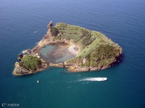 葡萄牙披萨岛,岛中有一个圆形湖泊,通过一条狭长水道与海洋相连。