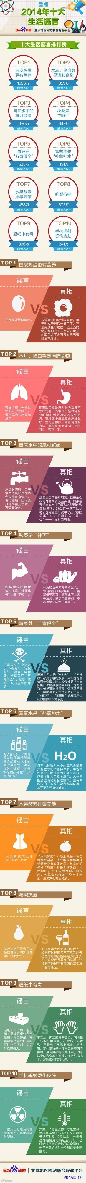 2014年已经结束,在2015年新年伊始,让我们从破除谣言、开启更理性的生活开始。谣言是整个社会的毒瘤。为了让真相晓之于众,破除谣言的侵害,2015年1月13日,百度知道联合北京地区网站联合辟谣平台,经过严密梳理和验证,为大家盘点《2014年十大生活谣言》。
