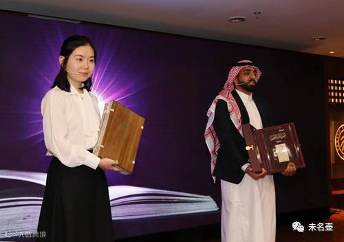 阿卜杜阿齐同学和孔雀同学分别代表沙中双方向阿卜杜勒·阿齐兹国王公共图书馆北京大学分馆赠送两国珍贵的书籍