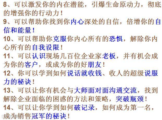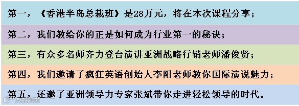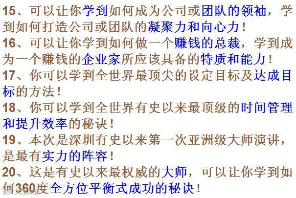 答:首先恭喜你过去取得的成就,但你还是要来参加。因为有一件不争的事实是:不管您喜欢与否,为了应付快速转变的世界,您都要不断提升自己的影响力和决断力和公众说服等能力的带领企业或者团队有市场竞争力。您不能停止,这就是许多企业家和总裁和管理者的最大错误——认为现在已经做得很好了,为什么还要再学习和继续成长。继续成长学习已不是选择,而是必须,您唯一的竞争优势,不是您拥有多少,而是您学习的速度有多快。参加学习让自己未来更成功这难道不是你想要的吗?所以来参加本次课程是值得的。