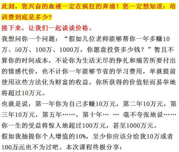 请问您一辈子的成功值多少钱?您一辈子的财富值多少钱?您的自信又值多少钱?您的开心快乐值多少钱?如果投资一万元让您赚到1千万、5千万,十亿您觉得贵吗?