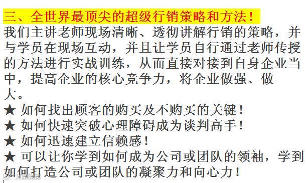 答:没错,很多人都是这样说的,可是他们后来发现,原来他们把钱都花在不该花的地方,花在了不能使他们增值的花费上,如买不必要的东西,而没有把钱投资在能让他们的人生增值的学习上。试问,你没有钱是不是因为你不懂赚钱的方法?不懂赚钱的方法肯定是赚不到钱你同意吗?假如不去学习赚钱的方法的话,那你怎么可能赚到钱呢所以没有钱的你更应该要来参加商业模式。参加完本次课程是非常值得的,赚钱靠销售,而销售的最高境界就是不销而销,客户求求你卖产品给他,因此你就不必再受金钱的困扰了,您将发现原来赚钱是这样的轻松,相信参加本次课程是你人生最正确的决定。