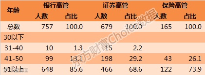 查看金融行业上市公司1600多位高管的资料,没有一名高管年龄在30岁以下,40岁以下的高管也属于百里挑一,银行业高管的八成以上超过50岁,证券和保险50岁以上高管的比例是7成左右。