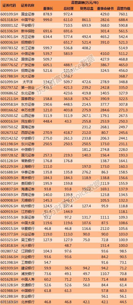 作为金融行业可以说最顶尖的人物,上市金融公司高管的薪资是很高很高的,根据2015年上市公司年度报告,52家金融上市公司的174个高管人员平均薪酬为250万元,最高年薪近千万元,最低的也有数十万,这也是很多金融人追求的方向。