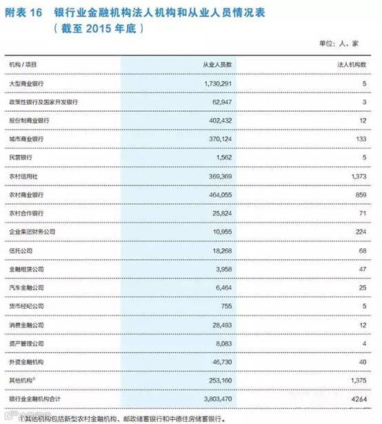 近期,银监会发布《中国银行业监督管理委员会2015年报》,数据显示:截至 2015 年底,我国银行业金融机构共有法人机构 4,262 家,从业人员 380 万人。