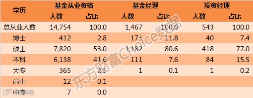公募基金员工的平均学历在金融业中是最高的,收入也是最高的。普通的公募基金从业员工,近60%的都是硕士以上学历,本科员工占比40%,大专及以下的员工就寥寥无几;要求更高的基金经理和投资经理,9成左右的人都是硕士以上学历,还有1成属于本科,根据公开资料全中国仅各有一名基金经理和投资经理是大专学历。
