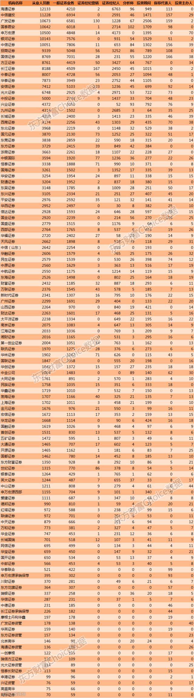 证券公司从业人员在30万左右,各家公司梯队并不是特别明显,是缓慢变化的。其中从业人员在1万以上的有海通证券、中信建投、广发证券、国泰君安、申万宏源、银河证券、中信证券七家大型券商。其余券商的从业人数从几十几百到几千不等。