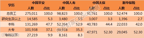 中国平安的研究生及以上学历人员占比5.3%高于其他三家保险公司的3%左右,从整体上看,保险行业的平均学历水平在本科附近。
