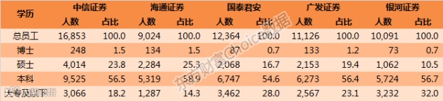数据上可以明显的看出,证券行业的平均学历水平确实高于银行业,中信证券、海通证券、广发证券的博士人员占比超过1%,硕士及以上学历占比超过20%;国泰君安和银河证券相比而言平均学历稍弱于另外三家券商,大专及以下学历的人员占比在30%左右。