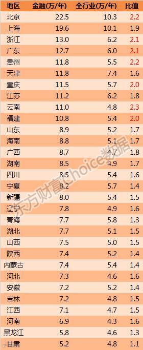 金融行业的工资与地方经济发展水平高度相关,北京、上海的金融人士年均薪酬在20万左右,另外浙江、广东、贵州、天津、重庆、江苏、云南、福建这8个省份的金融人士年薪超过10万,黑龙江、甘肃的金融人年薪仅仅超过5万。