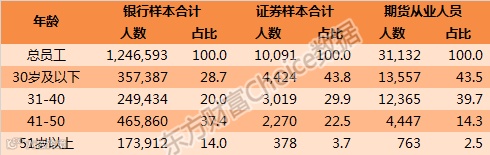 源源不断的年轻人涌入金融行业,30岁以下的金融人占比在30%以上,30岁、40岁、50岁的人也各有一席之地。50岁以上的人,在银行业占比相对较高,达到14%,证券和期货的从业人员中50岁以上人士占比仅为3%左右。这与各自岗位的性质也是息息相关的。