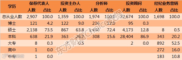 在整体学历水平相对较高的证券行业,不同的岗位类型学历分布也有很大的区别,其中保荐代表人、投资主办人、分析师的基础学历可以说就是硕士,占比在80%左右。投资顾问的学历要求稍低,86.9%以上投资顾问都是本科学历,另外有12.8%的投资顾问是硕士研究生。证券经纪业务营销的学历要求是较低的,只有20%的人员有本科学历,50%为大专,27%的人员为高中或中专。