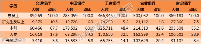 五大行的学历分配上,交通银行的平均学历水平较高,研究生以上学历的员工占比超过10%,本科占比67.7%,大专及以下学历占比为20%左右,中国银行的本科及以上学历占比为70%,建设银行本科及以上学历占比近6成,工商银行本科以上和以下学历各占一半,农业银行大专及以下学历的人员占比略高于本科及以上学历人员。