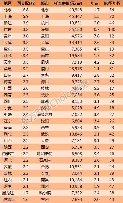 当然,也有幸福的城市啦,比如贵州,一年的可支配收入可以在贵阳买7.8平米的房,仅需12年可以搞定90平的房子,另外,重庆、云南、广西、宁夏也都是不错的选择。