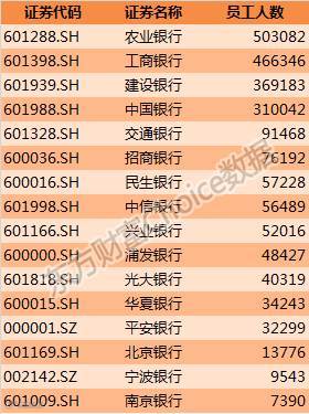 银行是金融行业的一大巨头,根据上市公司2015年年报数据,农业银行从业人员最多超过50万,另外三大国有银行从业人员通通超过30万。交通银行、招商银行、民生银行、中信银行、兴业银行的员工人数在5万到10万之间。上市银行中,宁波银行和南京银行的员工人数不足1万人。