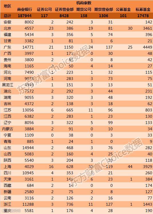 1897年,中国通商银行成为第一家中国人创办的银行,120年后,全中国已经有4000多家银行机构,存在着18万余家商业银行网点;1987年,深证特区证券公司成为中国第一家券商,虽然首家证券公司发展并不顺利,截止目前中国拥有了117家证券公司,8000多家证券营业部;1992年中国成立第一家期货公司广东万通期货,如今发展为158家期货公司,1306家期货营业部;1998年国泰基金和南方基金成为第一批基金公司,目前增加至101家公募基金公司,17000多家协会备案的私募机构。