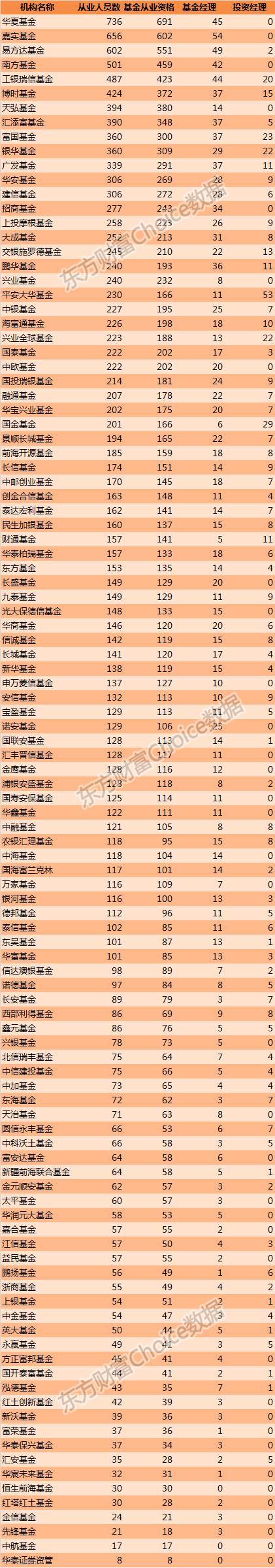 公募基金公司的从业人数在金融行业中并不算多,全员不到2万人,根据中国基金业协会的最新数据,华夏基金、嘉实基金、易方达基金、南方基金的从业人员数在500以上,另有工银瑞信基金、博时基金、天弘基金等62家基金公司从业人数在100至500人,信达澳银基金、诺德基金、长安基金等42家基金公司从业人数在100人以下。