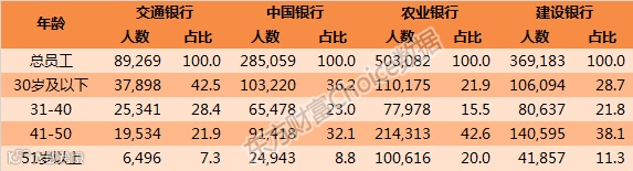 四个代表性的商业银行中,交通银行最年轻,30岁以下员工占比超过42%;中国银行和建设银行次之,6成的员工年龄在30-50岁之间;相较而言农业银行是几大行中平均年龄最大的,50岁以上人员占比达到了20%。