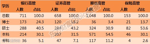 再看看金融业最顶尖的各高管,不论是银行、证券、期货、保险,90%的高管人员都是本科以上学历,其中银行和证券20%的高管具有博士学历,保险和期货高管的博士比例是13.7%和3.4%。相比而言期货公司的高管人员,学历水平要略低于银证保。