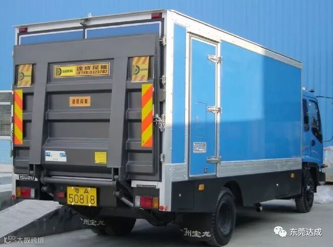 3、冷链运输用尾板:为了使车辆在冷冻仓库装卸时与仓库密封大门方便对接,同时又具备在配送点的快速装卸能力,这一类尾板通常都是暗藏在车辆的后尾下部,方便随时打开使用。这类尾板通常都是折叠结构,不同结构方式适用于各种后尾形式车,起重质量在 500~ 2 000 kg 之间,以铝制大板最为普遍。