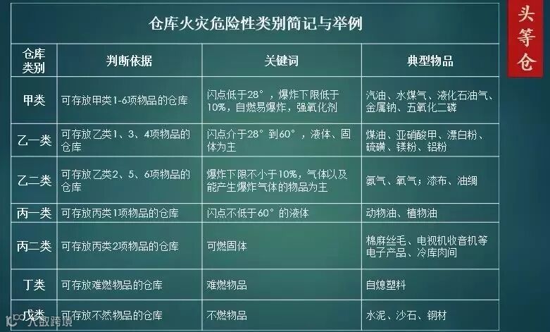 仓库存放物品的火灾危险性分为甲-乙-丙-丁-戊五大类,这五类仓库的火灾危险性依次递减。闪点与爆炸下限为火灾危险性的重要判断标准。