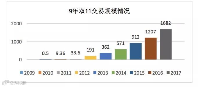 从 2009 年的 5200 万元,到 2017 年的 1682 亿元,增幅 39%。相当于 2017 年 1-9 月全国日均社会消费品零售额(964 亿元)的 1.7 倍, 其中无线端占比 90%。物流订单 8.12 亿个,同比增长 24%, 总支付笔数为 14.8 亿笔,同比增长 42%。购买额品类排名 前五:服装、日用品、家电音响、化妆品、家具。
