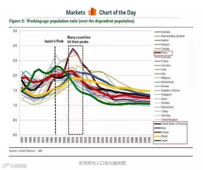 应该怎么看待这条曲线呢?专家认为,这种劳动人口下降会导致全球经济出现一个规律:日本化。