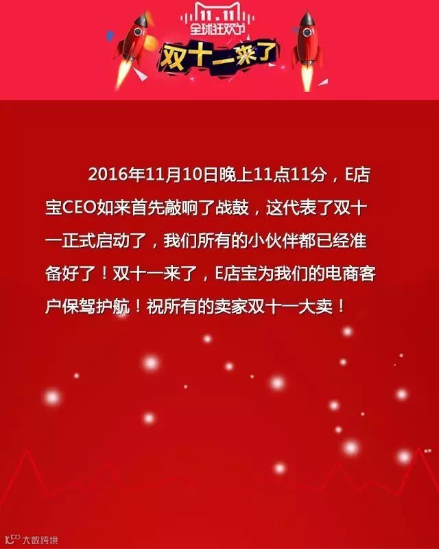 导读:2016年11月10日晚上11点11分,E店宝CEO如来首先敲响了战鼓,这代表了双十一正式启动了,我们所有的小伙伴都已经准备好了!双十一来了,E店宝为我们的电商客户保驾护航!祝所有的卖家双十一大卖!
