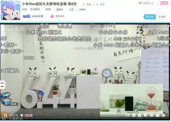 小米Max的新品直播选择了在B站宣传,这是一场针对二次元用户的直播营销,期间将以“小米Max超长持久”的续航能力为主题,24小时连续不间断直播。直播间不断邀请到各路二次元达人做客聊天,并设置了抽奖活动。直播共有超过1800万人围观,送出将近700台小米Max手机,每天吸引200多万UV参与,在日常流量较高的时段,同时在线人数通常都在10万以上,即使在深夜一两点,也有1万多人在线。