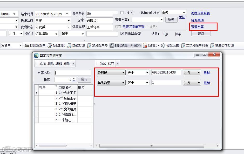 订单打印界面可以配合查询方案来筛选具有相同属性的订单批量打印处理;如下图1所示