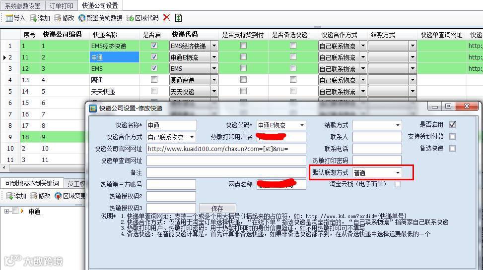 注意事项:对于顺丰、EMS等快递,它的默认联想方式不能够选择普通的