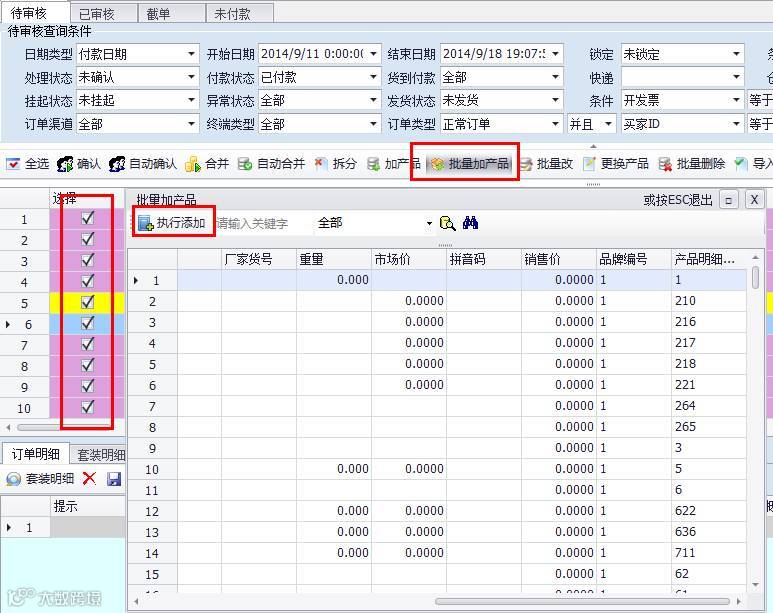 注意事项:加产品完成以后,注意把勾选的订单去掉勾;否则就是锁定状态,他人无法操作订单