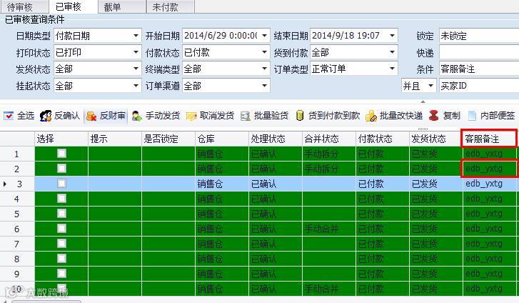 对于那些申请退款但是又需要发货的订单,可以在客服备注中备注:edb_yxtg;这样订单在验货的时候不会被拦截,可以直接验货成功;如下图8所示