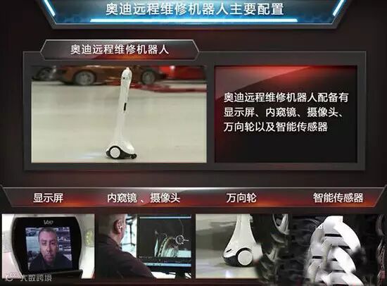日前,奥迪在美推出机器人修车助理远程诊断,配备了内窥镜、摄像头、显示屏、话筒,可以随处走动。通过机器人的帮助,地方零售店的修车师傅可以直接与美国总部的工程师进行沟通;机器人在检查汽车时,实时拍摄的视频会传送到总部工程师那里,工程师就可以以此判断汽车出现的问题,并远程指导地方员工进行修理。