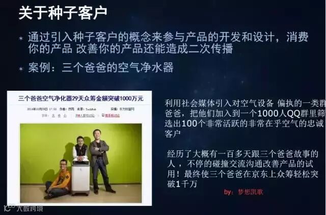 所以,需要从市场提取这些客户的样本做重点服务对象,这个对象就是种子用户,种子用户有很强大的力量,他们不仅使用你的产品,还能够给到你产品开发上一些建议,甚至愿意为你的产品来做宣传,具体可以看看小米的粉丝和锤子手机的粉丝。