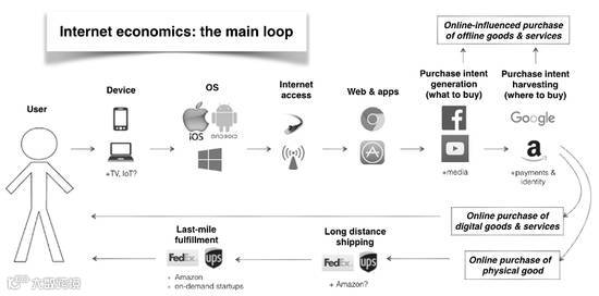 我们都生活在捆绑时代。美国的5大消费者技术巨头—Google、苹果、Facebook、Amazon以及微软已经从原来的产品线延伸到硬件、软件、服务等,彼此间常有业务重合、竞争不断。但是他们的收入和利润仍严重依赖于不受他们控制的外部技术。为了以更直观的方式说明这种外部依赖性,可以考虑一下一次典型的互联网会话—从用户到某种产生收入的动作然后再返回到用户(某些情况下)所要经过的路径。