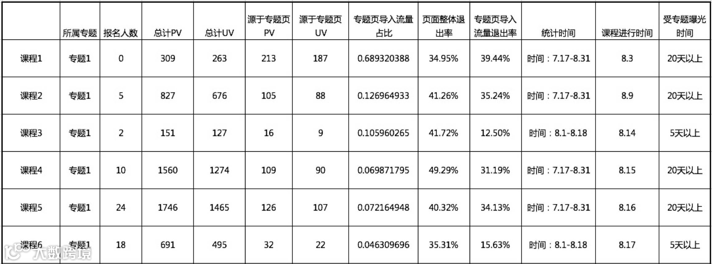 2.专题页的效率普遍较差。一方面是其跳出率超过40%,另一方面则是从专题页导到单堂课程的UV,最多也不过187,仅相当于专题页流量的10%左右,这个效率还是低得有些可怕的。