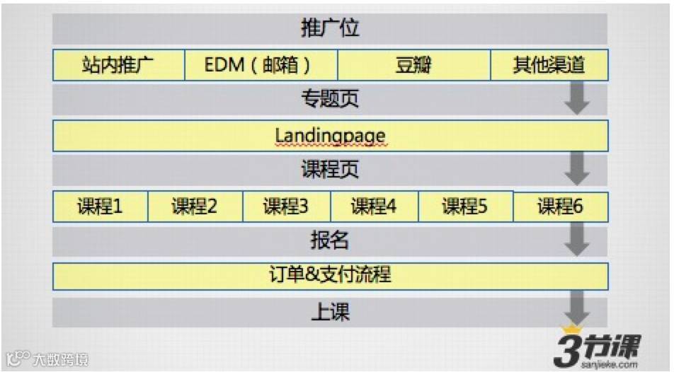 比如说,围绕着一个课程专题的运营,其触达到用户的整个流程大体应该是如下这样的: