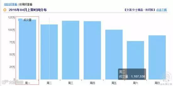 如上图显示,这是女装休闲裤行业的上下架时间段,从图可知可以在周一21时左右上下架宝贝。