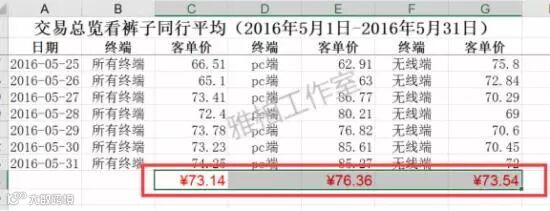 分析完核心3个要素之后,找出需要做竞品分析的子类目产品,对比同行平均值,计算近一个月或往年4、5、6月份客单价均值,通过数据表格分析数该子类目产品的行业均价73.14元,故如果客单价定在69或65元(综合考虑成本范围,例:成本是60元的裤子,定价65或69是相对比较危险的,要求运营能力要很强),则相对来说是一个不错的价格,利润可以,而且也可以达到行业的均值的转化率(前提是产品大众款本身没有问题)。