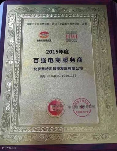 2016年4月11日,由中国电子商务协会发起的中国电商服务联盟主办的2015年度百强电商服务商颁奖典礼在浙江义乌国际电商博览会分会场成功举办,圣特尔·E店宝受邀出席,并荣获2015年度百强电商服务商。