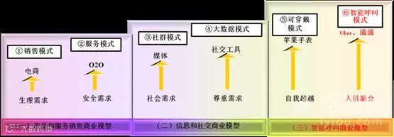 实际上,从互联网向“人机智能”的跨越不是一夜之间发生的,我们现在再回到世纪巅峰对决的Uber和滴滴快的。Uber这类软件是通过人和机器对话的方式,以人为核心发起需求,由机器进行响应的全新模式。这种模式也是人类和人工智能的第一次深刻握手,在这个信息交互过程中,人类和人工智能之间将开启一个全新的连接时代,其开创性可类比为机器与人之间的深度连接和对话:凡呼求即得到,凡寻找即寻见。Ubers开启的正是这种能够满足人类自我中心的人机对话和需求呼叫的商业模式。Uber的商业模式已经是人类商业历史发展过程中最顶端的商业模式,这种模式超越大数据和可穿戴设备,如下图。
