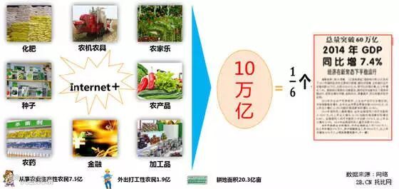 关于互联网农业市场价值,业内人士普遍认为约有10万亿人民币的规模,其中B2B农资环节约有2万亿,B2B农产品交易环节约有5万亿,在B2B食材配送环节约有3万亿,这其中并不包括土地流转所成交的大额度的金融交易。拿我国2014年的国民生产总值首次突破60万亿作比对,可以说互联网农业领域的市场规模相当于1/6的国民生产总值,其市场影响力和发展潜力巨大到难以想象,这给中国的投资者和农业电商的创造者带来了巨大的商业机会,也为中国日益收紧的经济现状注射了一剂强心针。