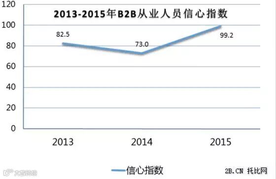 2015年12月,托比网发布了《2015年度中国B2B从业人员调查与分析报告》。报告显示,2015年B2B行业从业人员信心指数为99.2,较去年大幅增长35.9%。B2B指数提升已明显刺激到B2B行业的发展,B2B越来越受到传统企业以及初创型企业的关注和青睐。