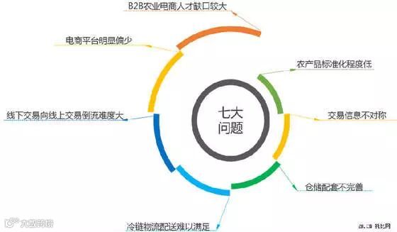 互联网+农业B2B电商面临七大问题:农产品标准化程度低,上下游交易信息不对称,产地与销售地的仓储配套设施不完善,运输途中的冷链物流配送还未能满足商家的需求,线下的大部分农产品交流向线上交易的过渡中难度较大,国内现有的关于农产品的电商平台特别是真正的农业B2B电商2.0/3.0还处在萌发期,从事农业B2B电商的人才缺口比较大。