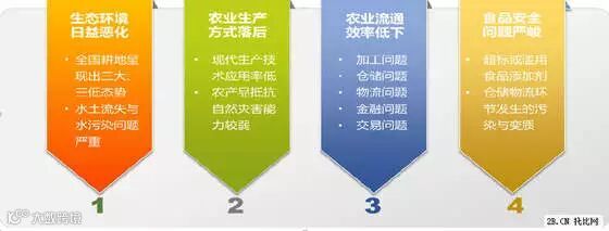 农业现代化这一概念在新中国建立之初就被提到国家战略层面,但不可否认,历经几十载中国农业发展始终保持着浓郁的传统气息,其中还残存着许多落后的元素。生态环境在每况愈下,水土流失也不断严重,耕地面积的红线已经达到预警状态;并且我国农业机械化水平是日本的1/90,法国的1/11,美国的1/5,这种状况不仅与发达国家难以比拟,而且低于世界的平均水平;由于工艺和物流仓储条件落后,粮食、马铃薯、水果和蔬菜的产后损失率分别高达7-11%、15-20%、15-20%和20-25%,据估计我国每年约有1亿多吨果蔬腐烂损失;民以食为天,而我国农产品食品安全屡屡受到挑战,其中包括仓储物流污染、添加剂乱加等因素造成的,这都需要通过更加有效的转变予以解决。
