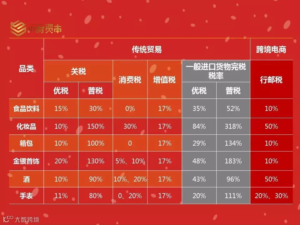 (资料来源:《中华人民共和国进境物品完税价格表》、《中国海关进出口关税税率税则》等,进口货物完税税率按消费税最低税率计算)