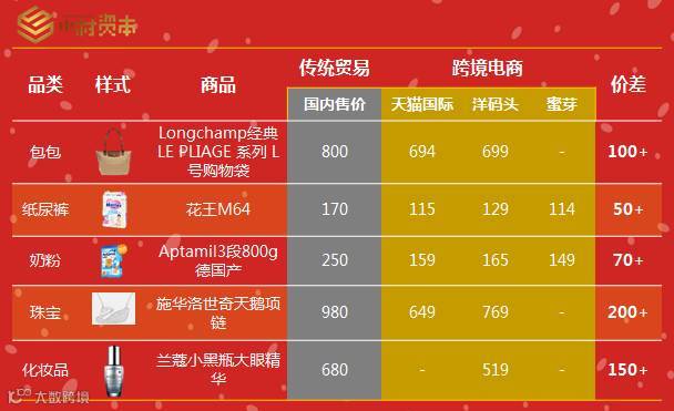 典型产品传统贸易与跨境进口电商价格对比