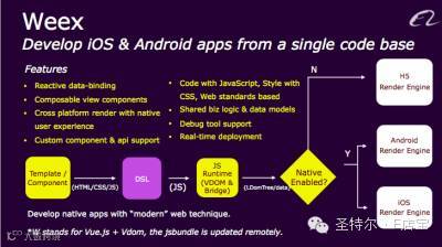 Weex就是我们想要的杀手锏,开发者可以通过一套跨平台的代码构建iOS和Android的APP。在构建应用UI的时候,开发者可以使用我们的基础库,这个库抽象了不同平台之间的差异性。开发者面对的DSL是基于一个叫做Vue.js的轻量级js库,相对于React的JSX语法,这是一个更加面向组件的、脚本样式分离的语言,对于开发者来说更加友好,更利于开发者和设计师之间的协作。JSBundle可以所见即所得的进行及时更新,V-DOM的抽象层提供了跨平台渲染能力,同时也具备native组件优雅降级的能力。