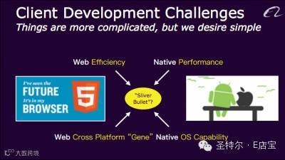 在移动时代,移动设备的计算能力发展的越来越迅猛。更重要的是,移动操作系统将移动设备上百个sensor的能力暴露了给上层的应用,使得我们能获得比在broswer里更强的能力。这样app侧就能够做到更多的以前在browser无法做到的事情。所以,互联网发展到今天,到了移动互联网的时代,我们真正意义进入到了一个富客户端时代,之前简单清晰的云端界限被彻底的模糊。
